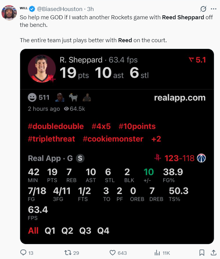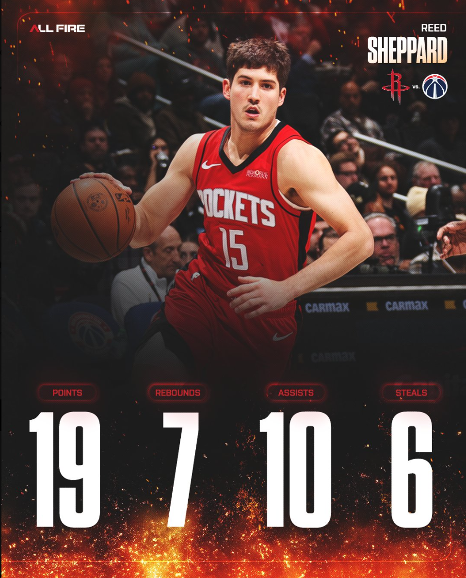北京时间3月3日,火箭123-118击败奇才稳住西部第三的席位。这场比赛杜兰特与申京双双斩获30+的数据,但这两人合计出现14次失误,所以这场比赛赢球的第一亮点应该是里德-谢泼德,他在攻防两端的贡献才是最出彩的,小贾伤停或许成为谢泼德发迹的一个转折点。