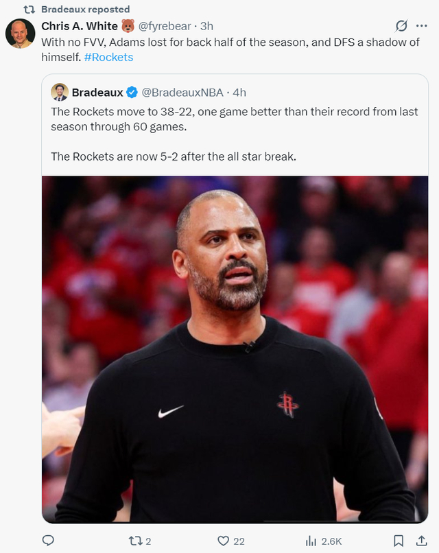 根据火箭记者Bradeaux的说法,火箭队战绩提升到38胜22负,这已经比上赛季的60场的战绩更胜一筹,全明星周末后火箭战绩5胜2负。
